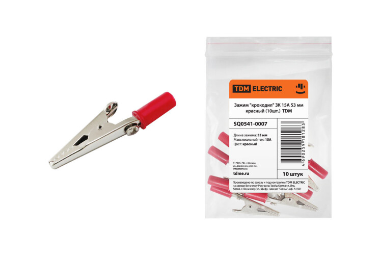 Зажим "крокодил" ЗК 15А 53мм красный (10шт) | SQ0541-0007 | TDM